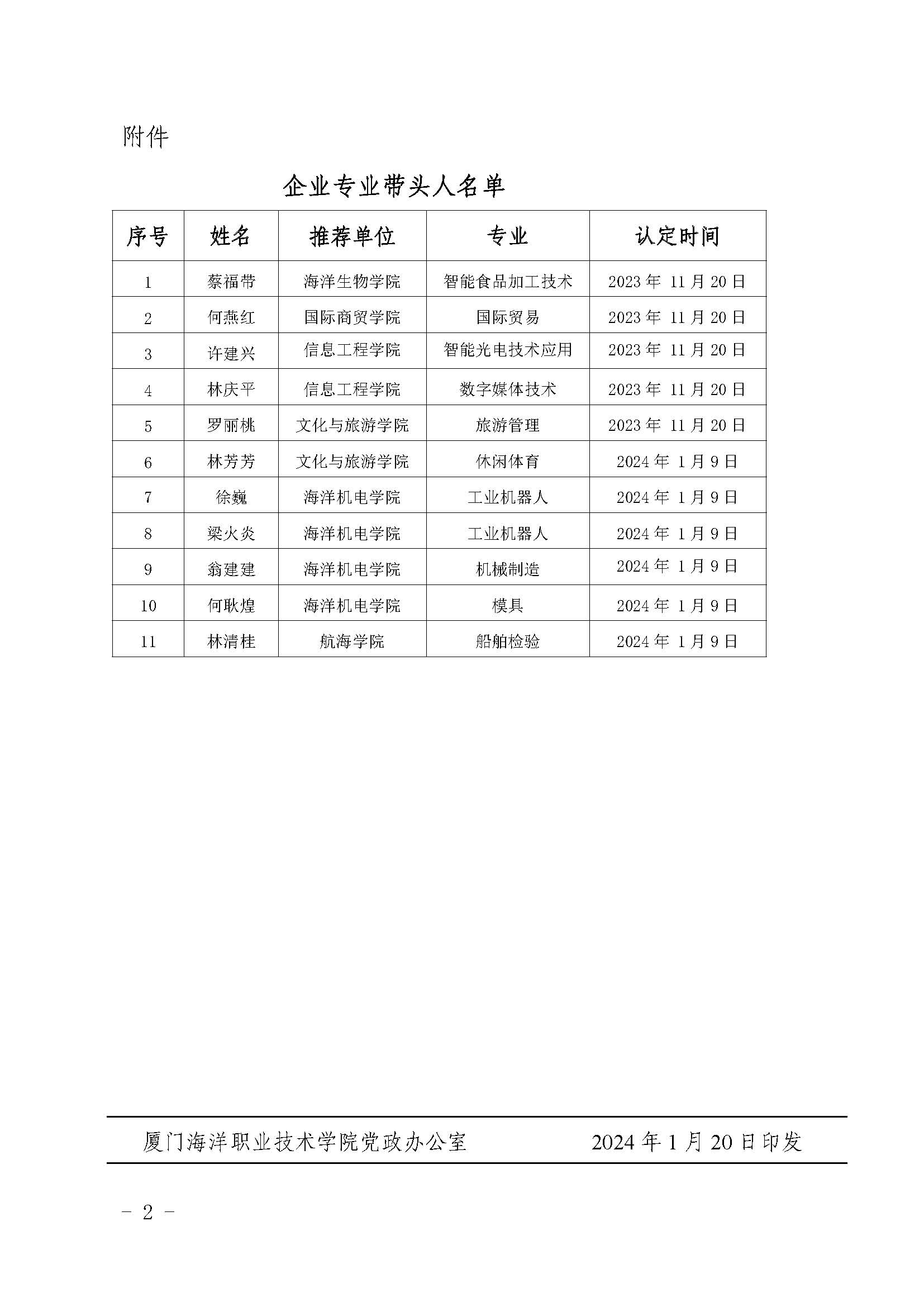 1月19日,廈門海洋職業(yè)技術(shù)學(xué)院公布企業(yè)專業(yè)帶頭人認(rèn)定人員名單的通知,根據(jù)《廈門海洋職業(yè)技術(shù)學(xué)院專業(yè)帶頭人和骨干教師選拔與管理暫行辦法(試行)》(廈海職院〔2018〕28號(hào))文件精神,認(rèn)定鳳凰創(chuàng)壹董事長(zhǎng)林慶平等11人為企業(yè)專業(yè)帶頭人,任期三年。