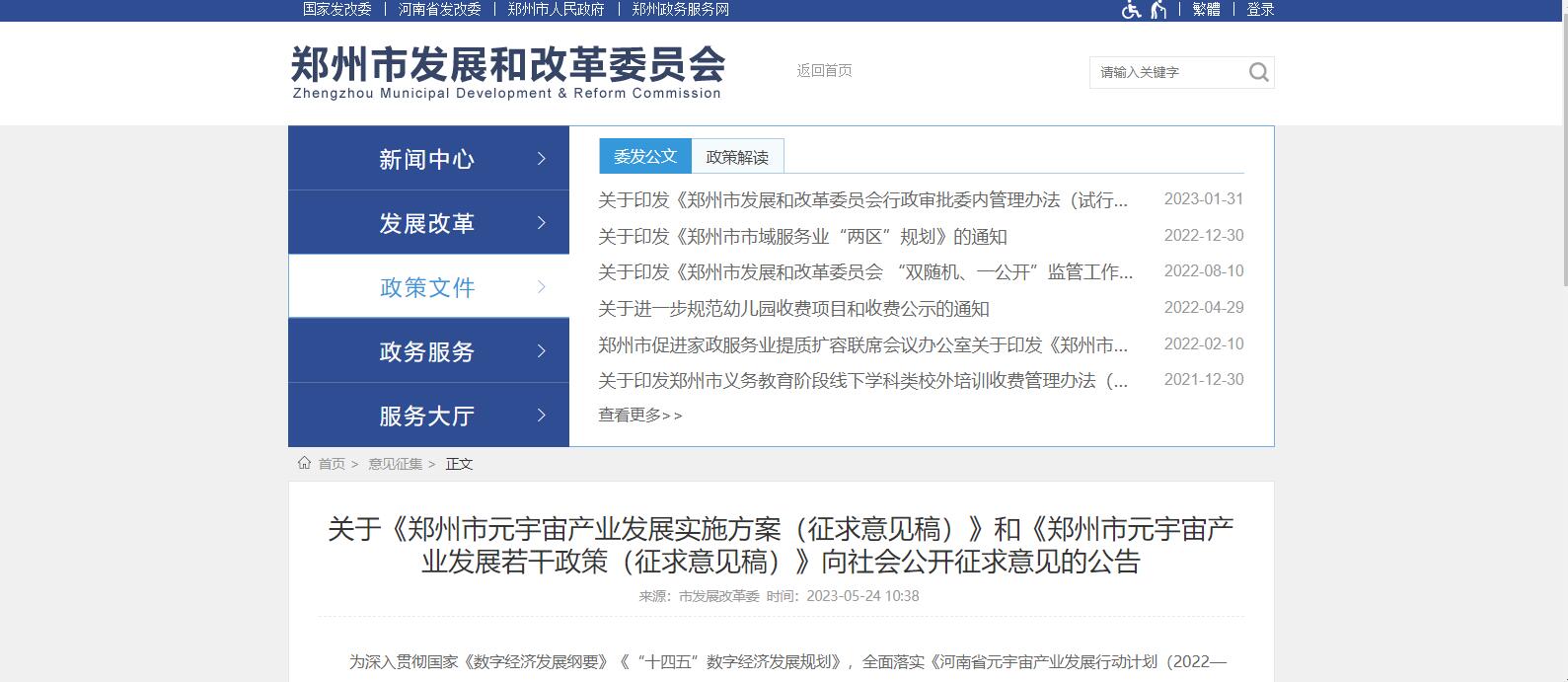 為加快構(gòu)建鄭州特色元宇宙產(chǎn)業(yè)生態(tài)體系,搶占未來產(chǎn)業(yè)制高點(diǎn),帶動(dòng)全市數(shù)字經(jīng)濟(jì)彎道超車、換道領(lǐng)跑,培育新的經(jīng)濟(jì)增長(zhǎng)點(diǎn)。5月24日,鄭州發(fā)改委網(wǎng)站發(fā)布《鄭州市元宇宙產(chǎn)業(yè)發(fā)展實(shí)施方案(征求意見稿)》(以下簡(jiǎn)稱《方案》)和《鄭州市元宇宙產(chǎn)業(yè)發(fā)展若干政策(征求意見稿)》(以下簡(jiǎn)稱《若干政策》),并向社會(huì)公開征求意見。