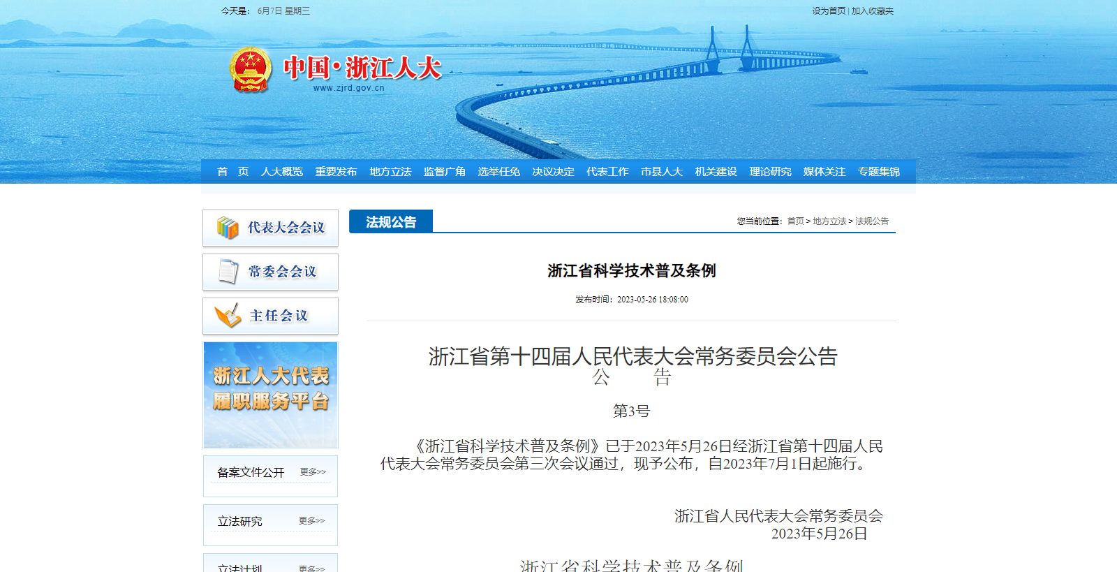 近日,《浙江省科學(xué)技術(shù)普及條例》經(jīng)浙江省第十四屆人民代表大會常務(wù)委員會第三次會議通過,自2023年7月1日起施行?!稐l例》對科普資源規(guī)劃、活動舉辦、人才隊伍建設(shè)等內(nèi)容都作了明確規(guī)定,機關(guān)、團(tuán)體、企事業(yè)單位、大中小學(xué)都有新任務(wù)了!一起來看↓↓