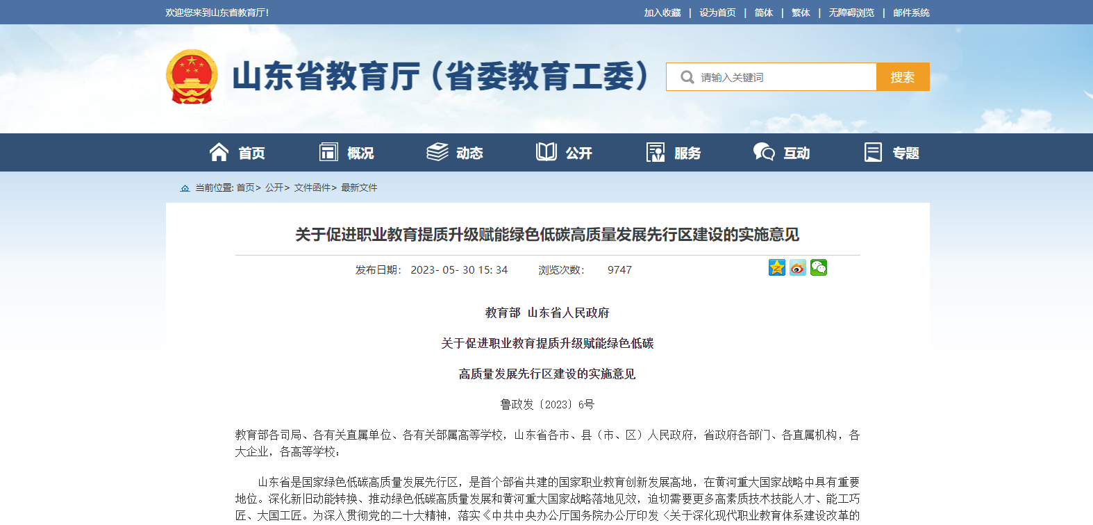 山東省是國家綠色低碳高質(zhì)量發(fā)展先行區(qū),是首個部省共建的國家職業(yè)教育創(chuàng)新發(fā)展高地,在黃河重大國家戰(zhàn)略中具有重要地位。深化新舊動能轉(zhuǎn)換、推動綠色低碳高質(zhì)量發(fā)展和黃河重大國家戰(zhàn)略落地見效,迫切需要更多高素質(zhì)技術(shù)技能人才、能工巧匠、大國工匠。為深入貫徹黨的二十大精神,落實(shí)《中共中央辦公廳國務(wù)院辦公廳印發(fā)〈關(guān)于深化現(xiàn)代職業(yè)教育體系建設(shè)改革的意見〉的通知》要求,支持和服務(wù)山東產(chǎn)業(yè)轉(zhuǎn)型升級、實(shí)現(xiàn)高質(zhì)量發(fā)展,教育部和山東省人民政府特制定本實(shí)施意見。