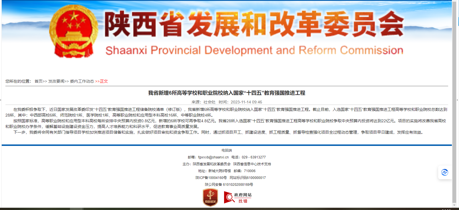 陜西省新增6所高等學(xué)校和職業(yè)院校納入國家“十四五”教育強國推進工程