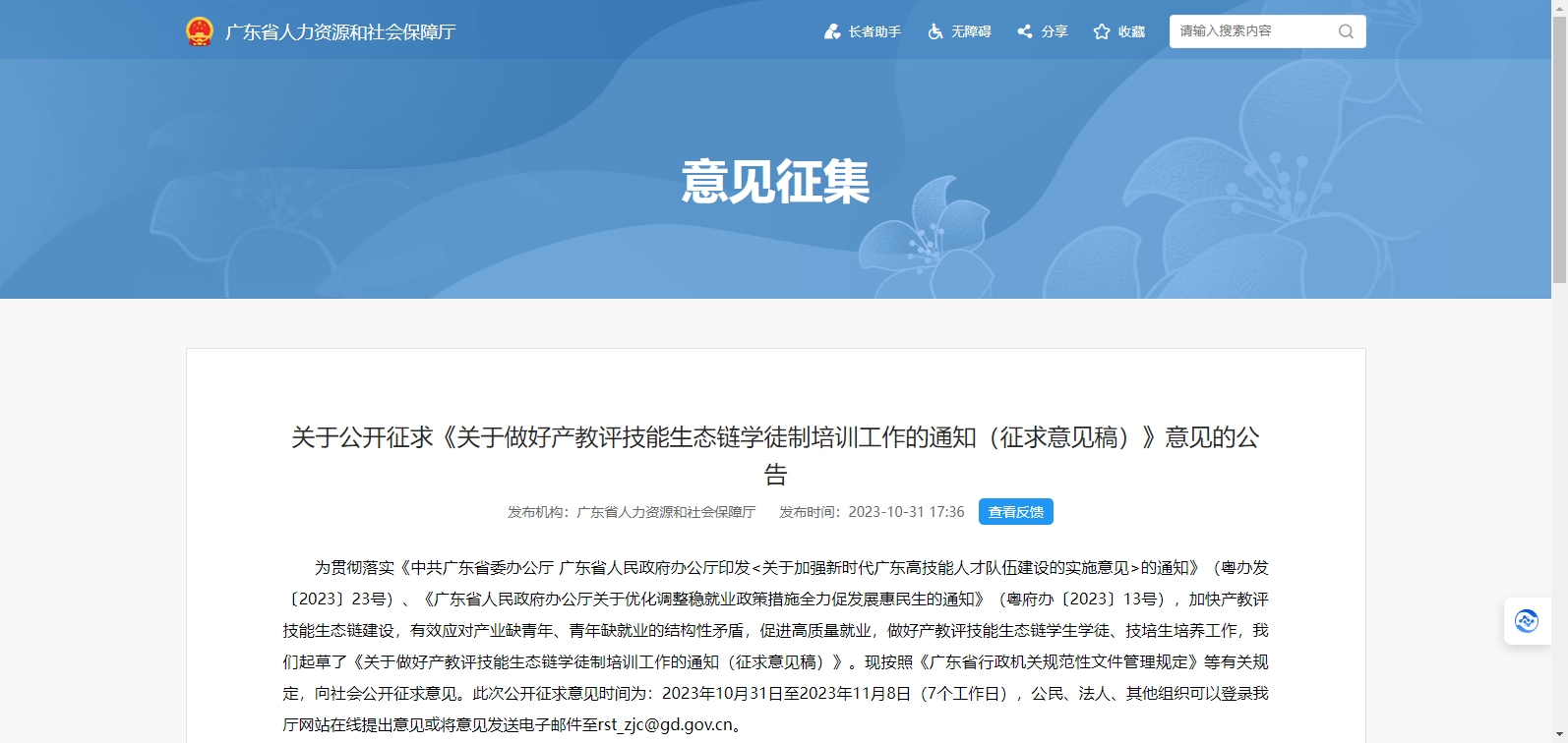 近日,廣東省人力資源和社會保障廳在其官網(wǎng)發(fā)布關(guān)于公開征求《關(guān)于做好產(chǎn)教評技能生態(tài)鏈學(xué)徒制培訓(xùn)工作的通知(征求意見稿)》意見的公告,按照《廣東省行政機(jī)關(guān)規(guī)范性文件管理規(guī)定》等有關(guān)規(guī)定,向社會公開征求意見。截止征求意見時間未收到有效反饋。