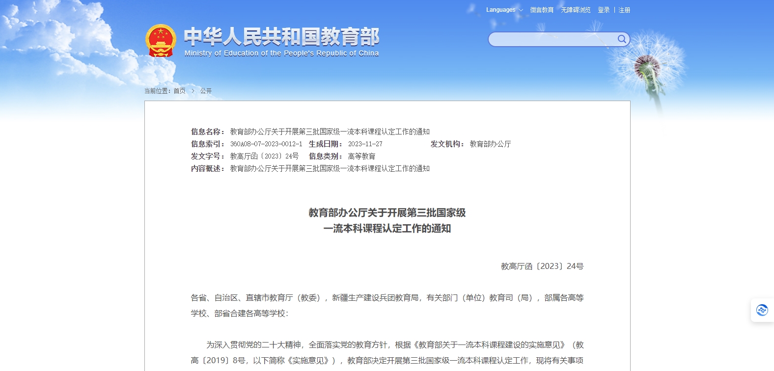 教育部辦公廳關(guān)于開(kāi)展第三批國(guó)家級(jí) 一流本科課程認(rèn)定工作的通知