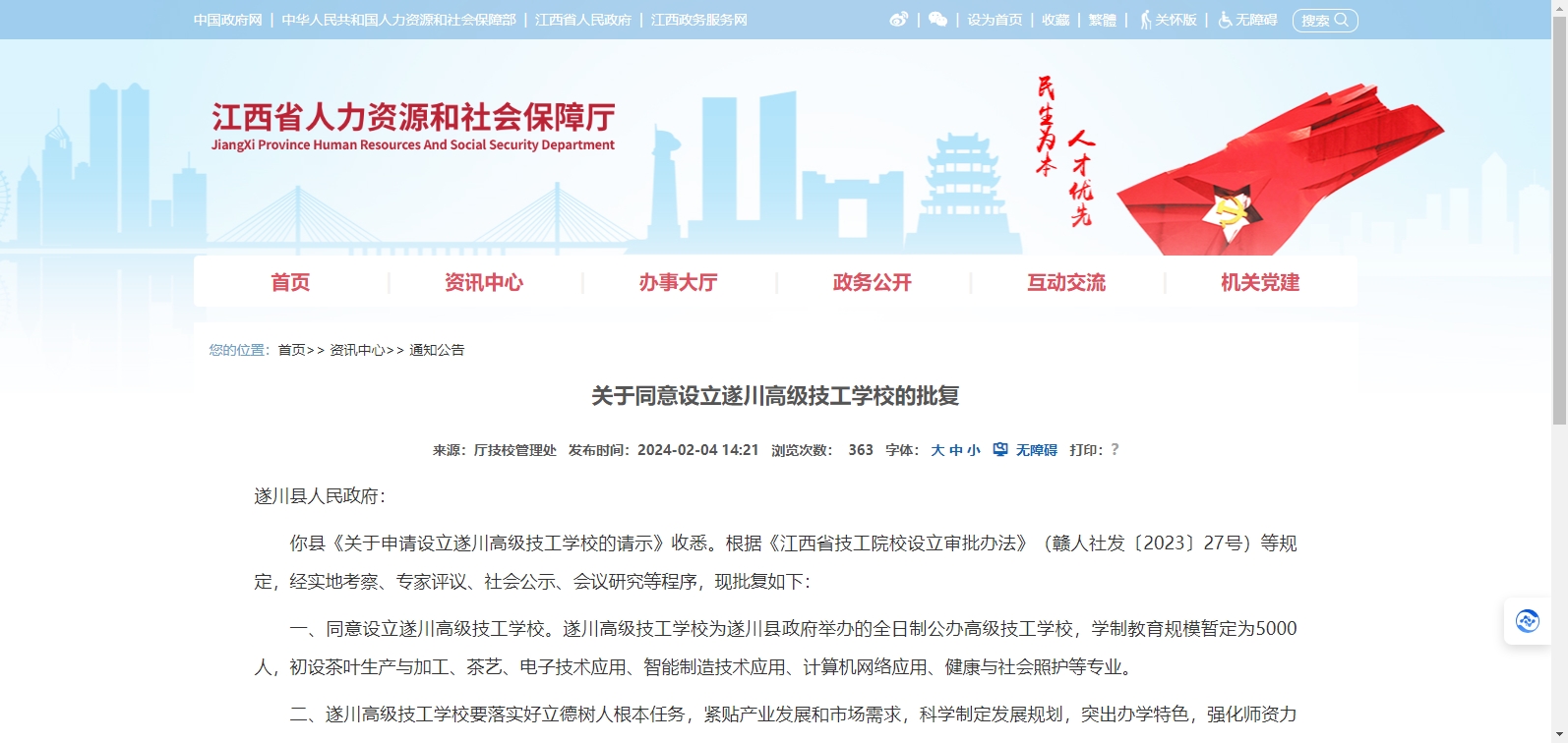 你縣《關(guān)于申請(qǐng)?jiān)O(shè)立遂川高級(jí)技工學(xué)校的請(qǐng)示》收悉。根據(jù)《江西省技工院校設(shè)立審批辦法》(贛人社發(fā)〔2023〕27號(hào))等規(guī)定,經(jīng)實(shí)地考察、專家評(píng)議、社會(huì)公示、會(huì)議研究等程序,現(xiàn)批復(fù)如下: