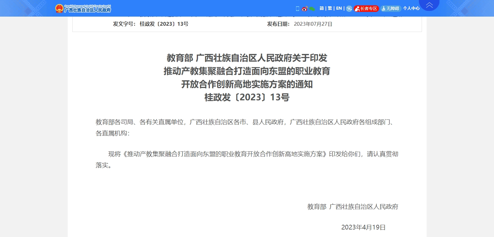 教育部、廣西壯族自治區(qū)人民政府聯(lián)合印發(fā)了《推動產(chǎn)教集聚融合打造面向東盟的職業(yè)教育開放合作創(chuàng)新高地實(shí)施方案》