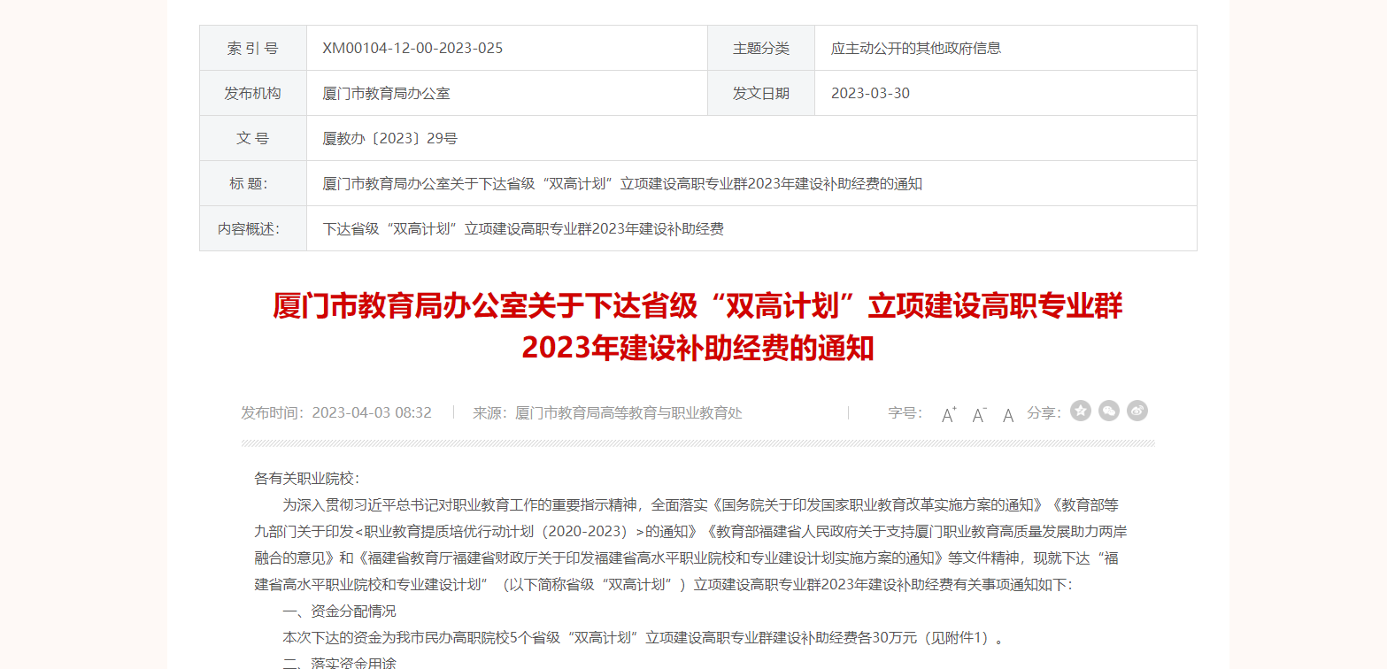 近日,廈門市教育局發(fā)布《關(guān)于下達(dá)省級(jí)“雙高計(jì)劃”立項(xiàng)建設(shè)高職專業(yè)群2023年建設(shè)補(bǔ)助經(jīng)費(fèi)的通知》,為我市民辦高職院校5個(gè)省級(jí)“雙高計(jì)劃”立項(xiàng)建設(shè)高職專業(yè)群建設(shè)補(bǔ)助經(jīng)費(fèi)各30萬元。 ......