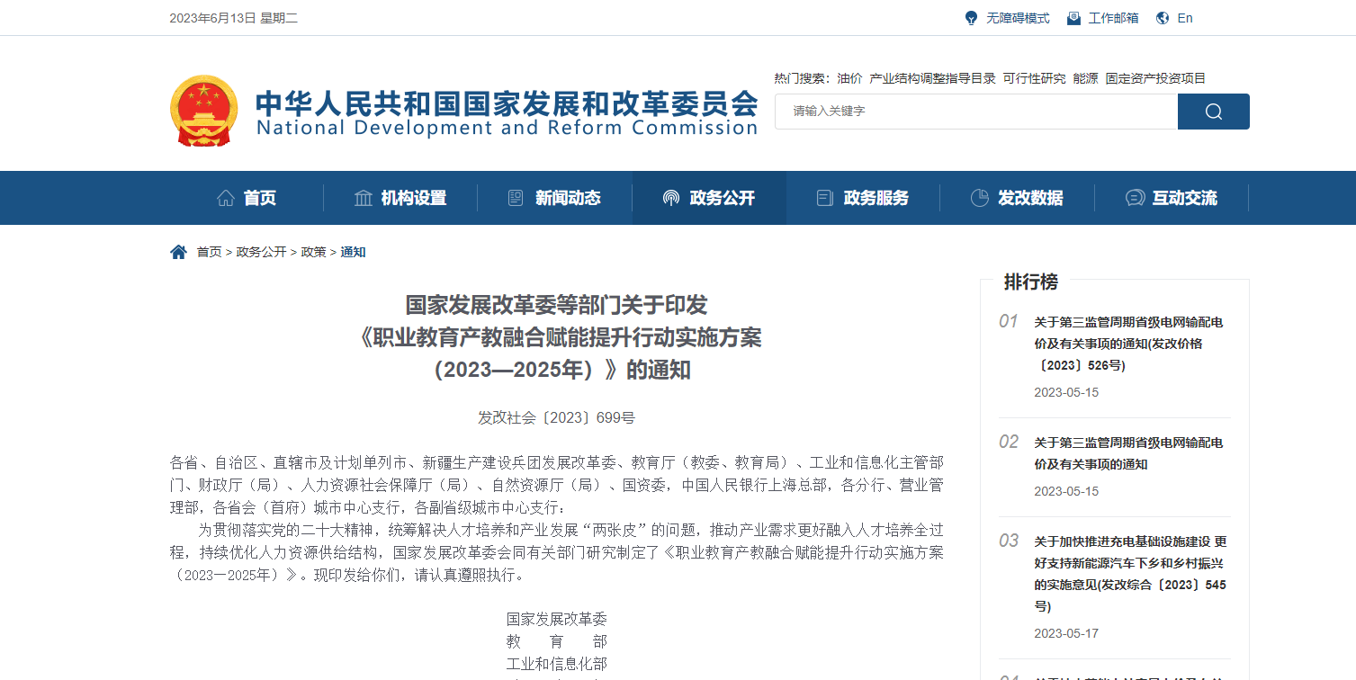 國家發(fā)展改革委等部門印發(fā) 《職業(yè)教育產(chǎn)教融合賦能提升行動(dòng)實(shí)施方案 (2023—2025年)》的通知