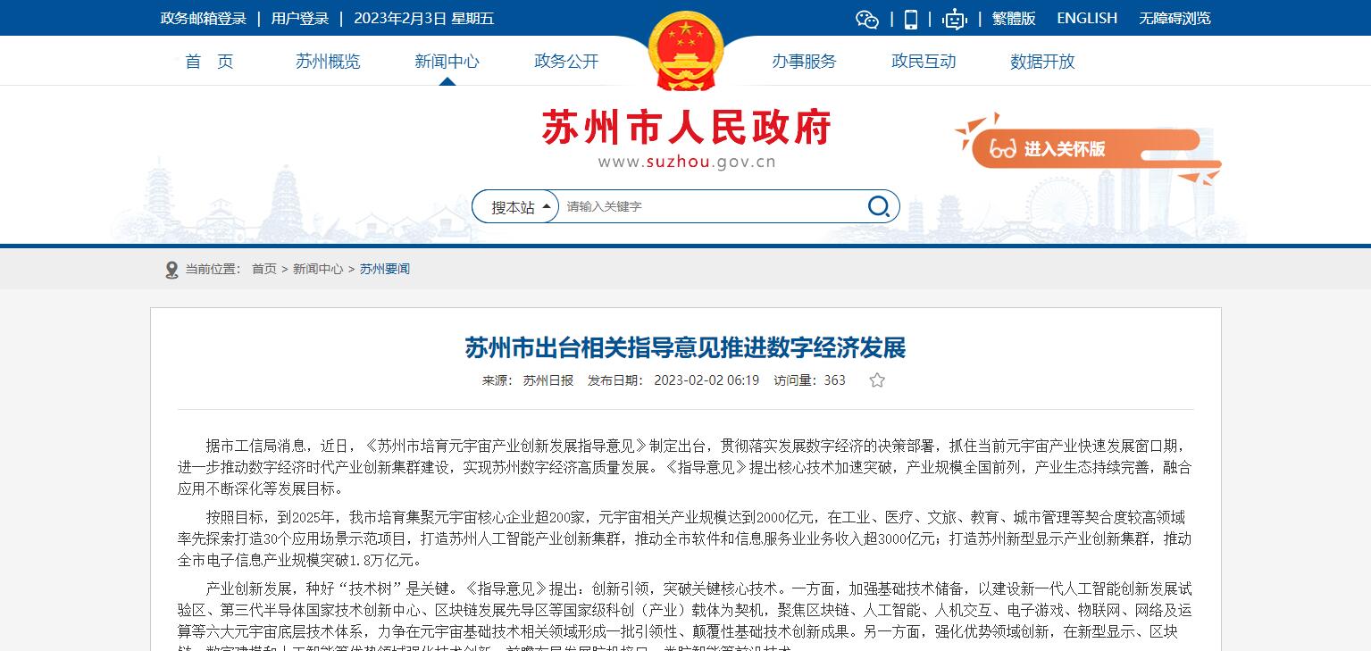 蘇州發(fā)布培育元宇宙產(chǎn)業(yè)創(chuàng)新發(fā)展指導(dǎo)意見:到2025年元宇宙相關(guān)產(chǎn)業(yè)規(guī)模達(dá)到2000億元