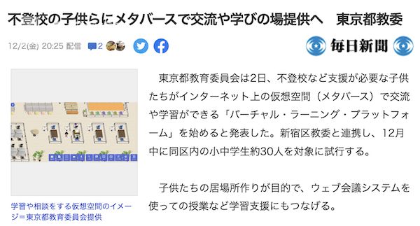 據(jù)《每日新聞》等日媒報道,東京都教育委員會12月2日宣布,為了幫助厭學(xué)兒童,將通過元宇宙平臺幫助他們進(jìn)行日常學(xué)習(xí)和交流。東京都教委將和新宿區(qū)教委合作,在12月以新宿區(qū)大約30名中小學(xué)生為對象先進(jìn)行試運......