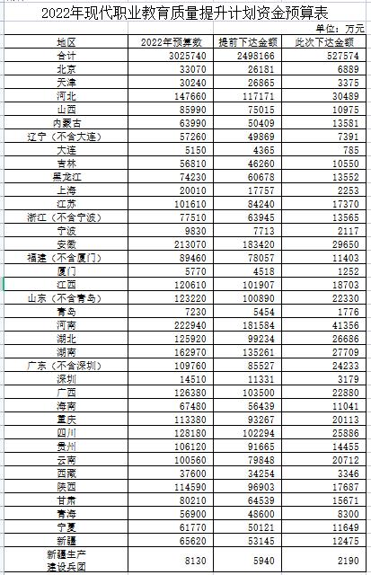 據(jù)財(cái)政部官網(wǎng),財(cái)政部、教育部近日發(fā)布通知,下達(dá)2022年現(xiàn)代職業(yè)教育質(zhì)量提升計(jì)劃資金預(yù)算,本次下達(dá)資金預(yù)算金額為52.76億元,加上已提前下達(dá)金額249.81億元,目前累計(jì)下達(dá)預(yù)算為302.57億元。......
